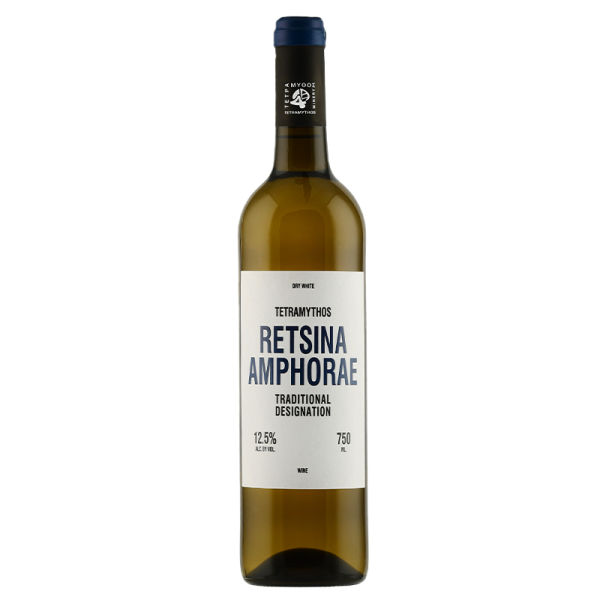 Tetramythos Retsina is a high-quality, organic Greek white wine made from 100% Roditis grapes, fermented in clay amphorae with pine resin. It features a pale lemon color with aromatic notes of citrus, pear, and subtle pine. On the palate, it is fresh, juicy, and well-balanced with crisp acidity.